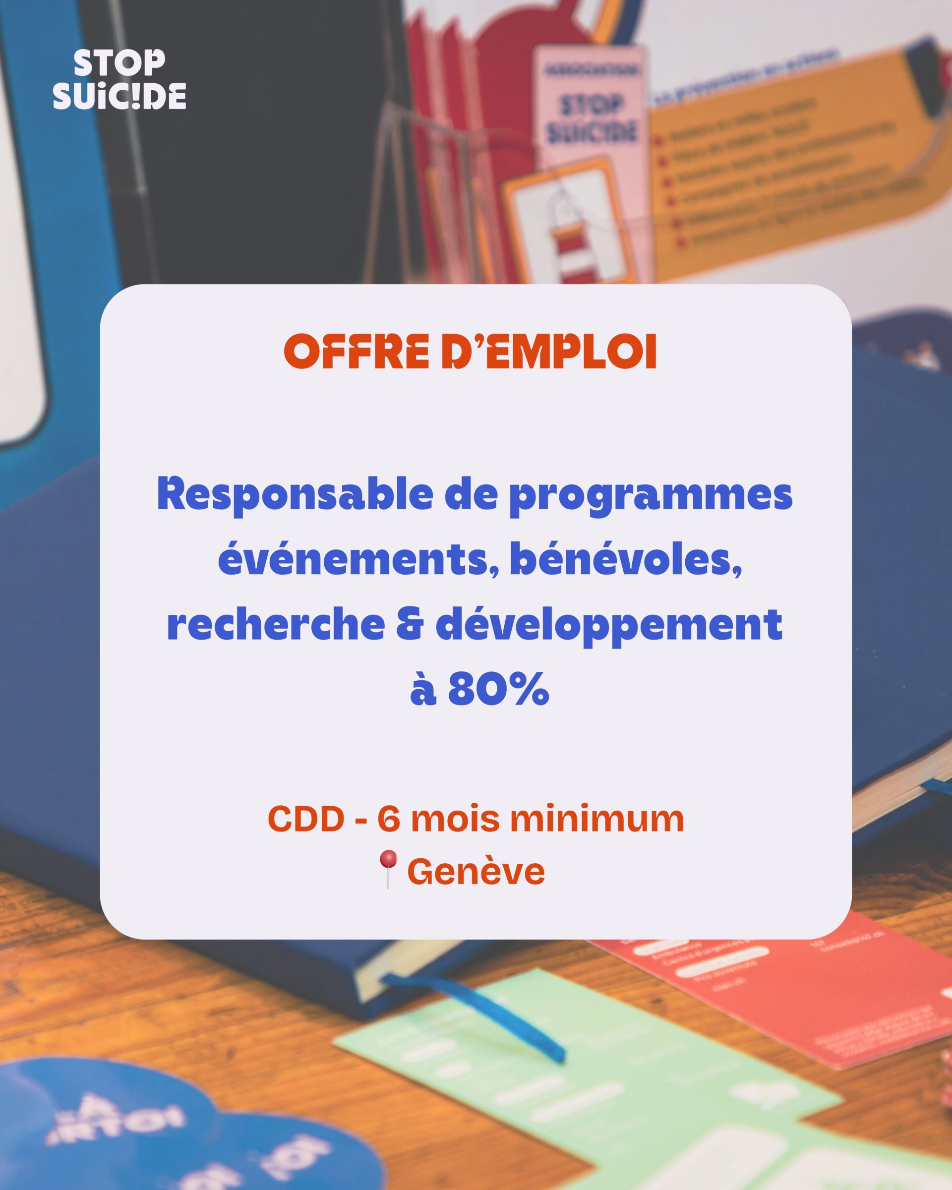 STOP SUICIDE est active dans la prévention du suicide chez les jeunes (15-29 ans) en Suisse romande. L’association a pour mission de lever le tabou, ouvrir le dialogue et faire le lien avec les plateformes d’aide.
