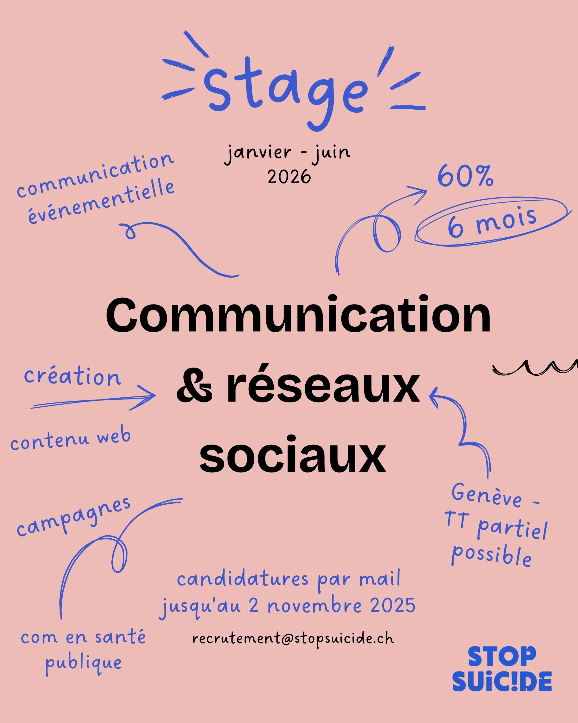 Les candidatures (CV + lettre de motivation) sont à envoyer jusqu'au 2 novembre 2025 à recrutement@stopsuicide.ch