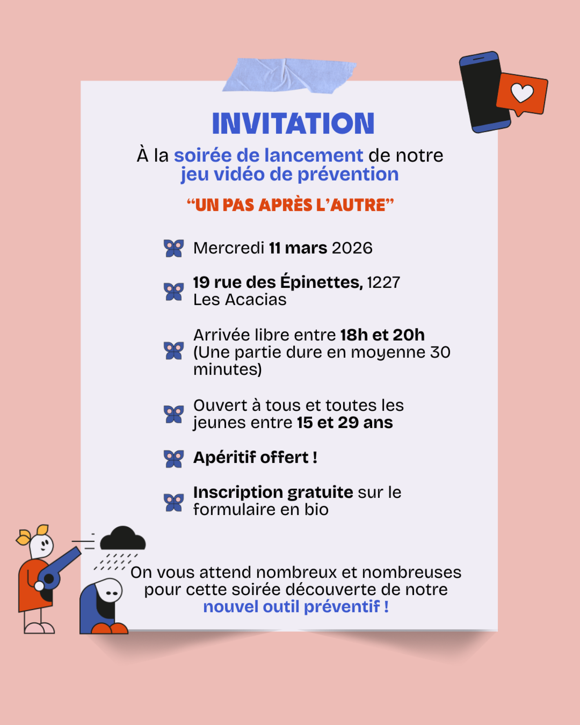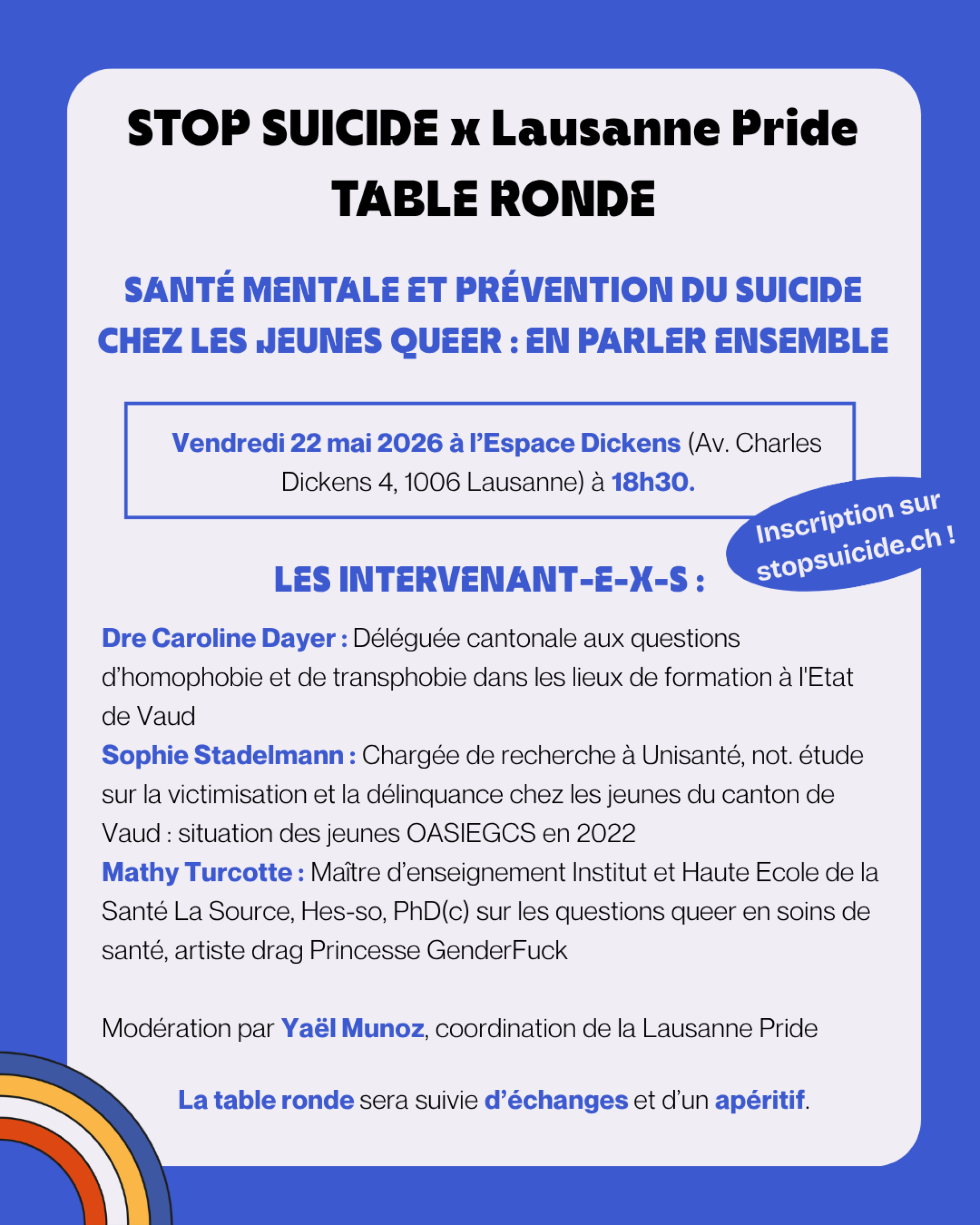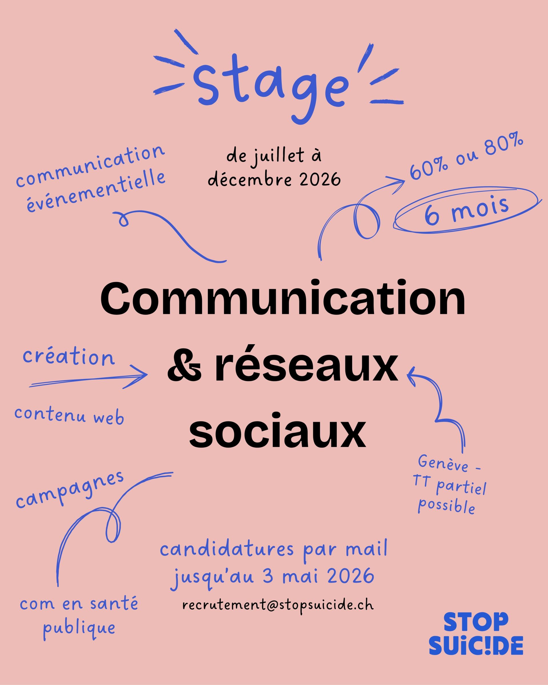 STOP SUICIDE est active dans la prévention du suicide chez les jeunes (15-29 ans) en Suisse romande. L’association a pour mission de lever le tabou, ouvrir le dialogue et faire le lien avec les plateformes d’aide.