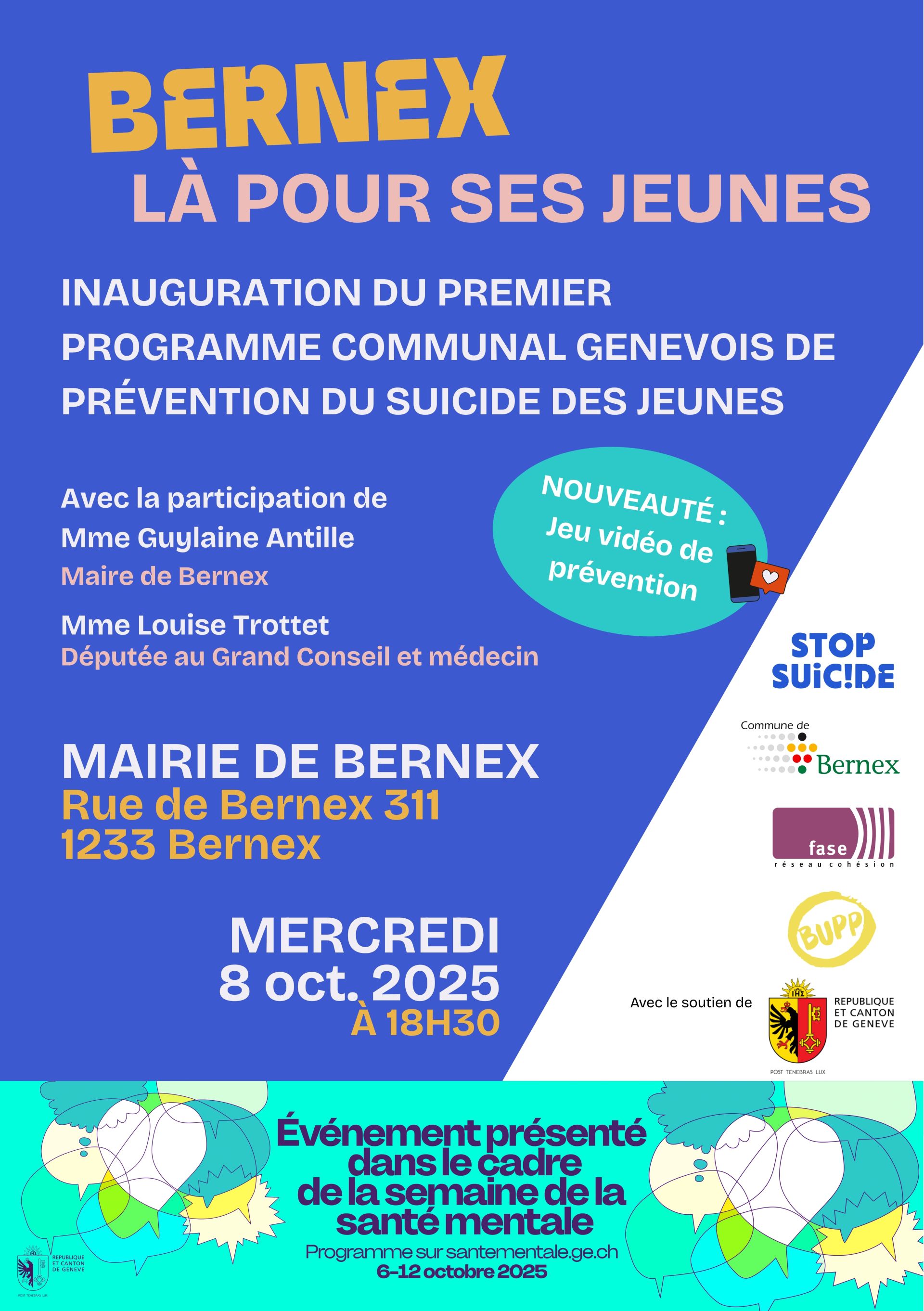 Cette soirée marquera le lancement du premier programme communal genevois de prévention du suicide des jeunes et réunira politiques, professionnel-les et habitant-es de Bernex autour d’un même but : prendre soin et sensibiliser à la santé mentale des jeunes.